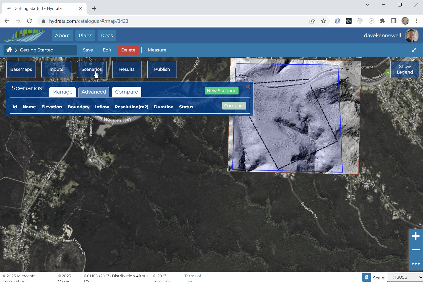 button. This will tell the server to package up all your data into Hydrata’s *.zipformat, ready for running in the next step. The Scenario status should change fromSaved->Building->Built. This process can take between 1 and 10 minutes, depending on the number of triangles in your model mesh.You can click the